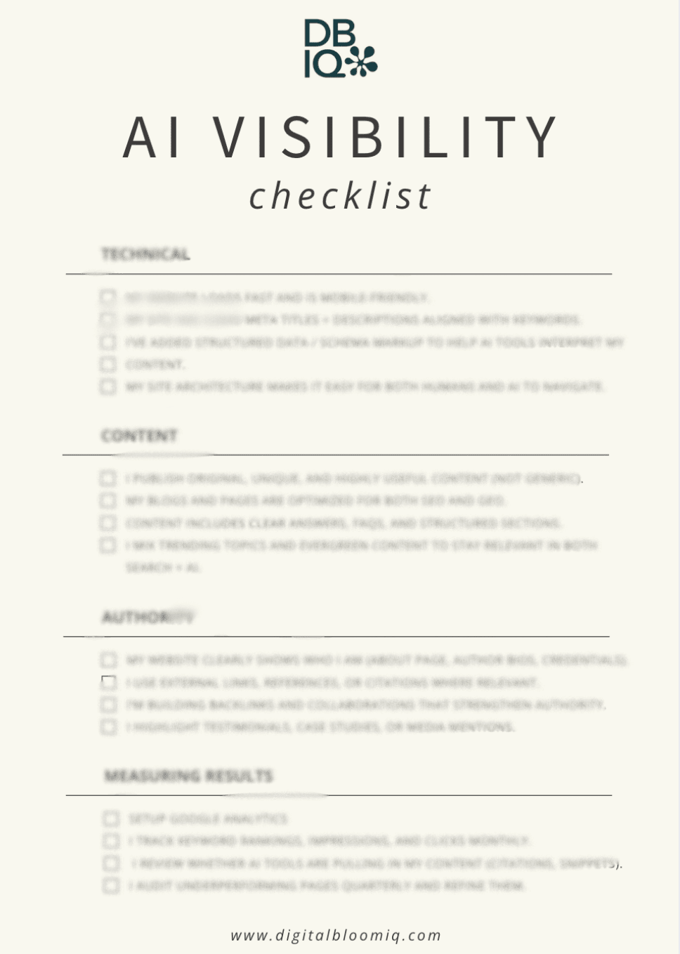 Get your free AI Visibility Checklist and learn the 10 essentials every business needs to start getting found in Google and AI tools like ChatGPT, Perplexity, and Google AI Overviews.